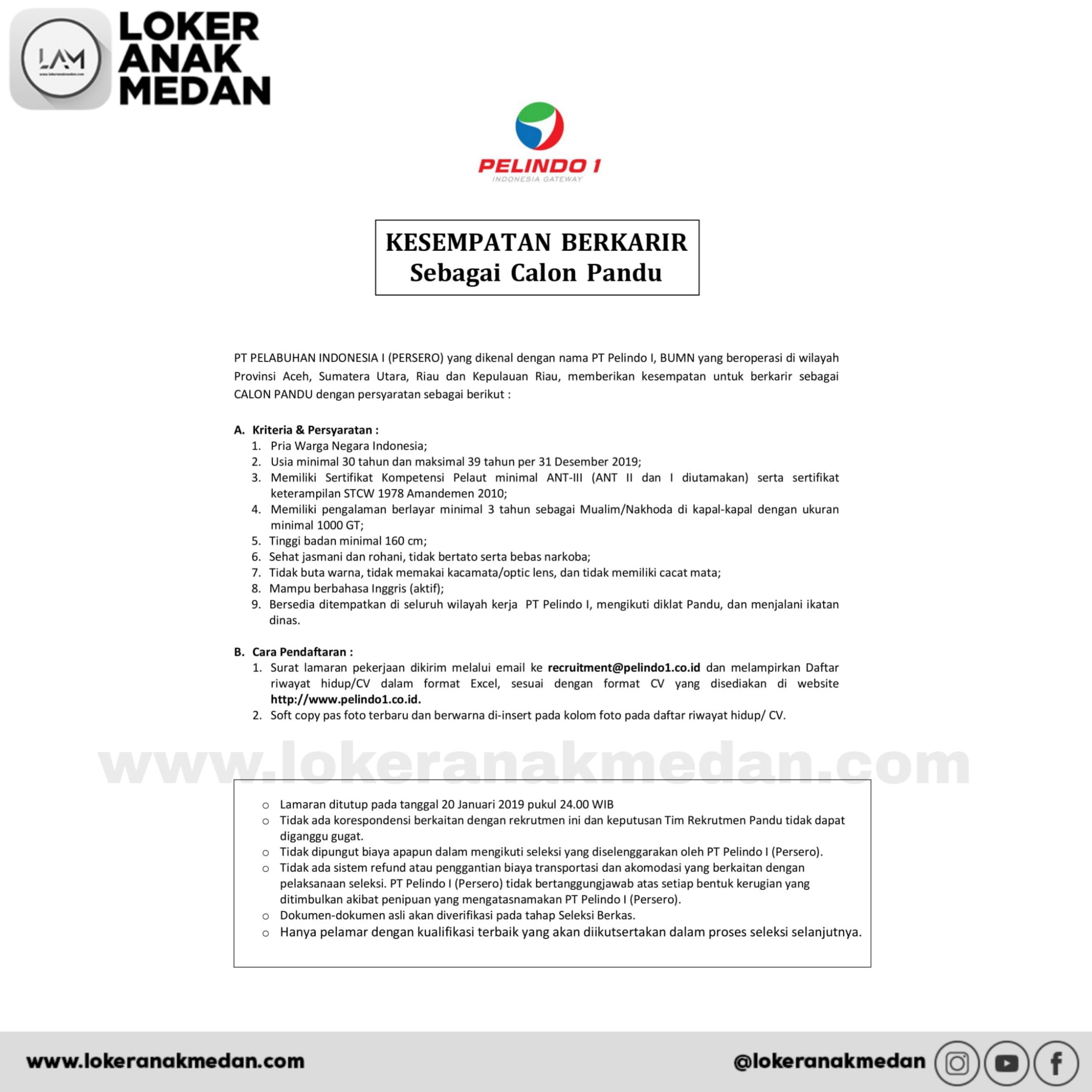 - Tidak dipungut biaya apapun dalam mengikuti seleksi yang diselenggarakan oleh PT Pelindo I ( Persero).