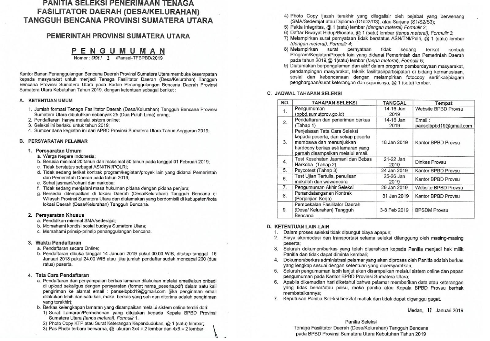 Penerimaan Tenaga Fasilitator Daerah Tangguh Bencana Provinsi Sumatera Utara 2019