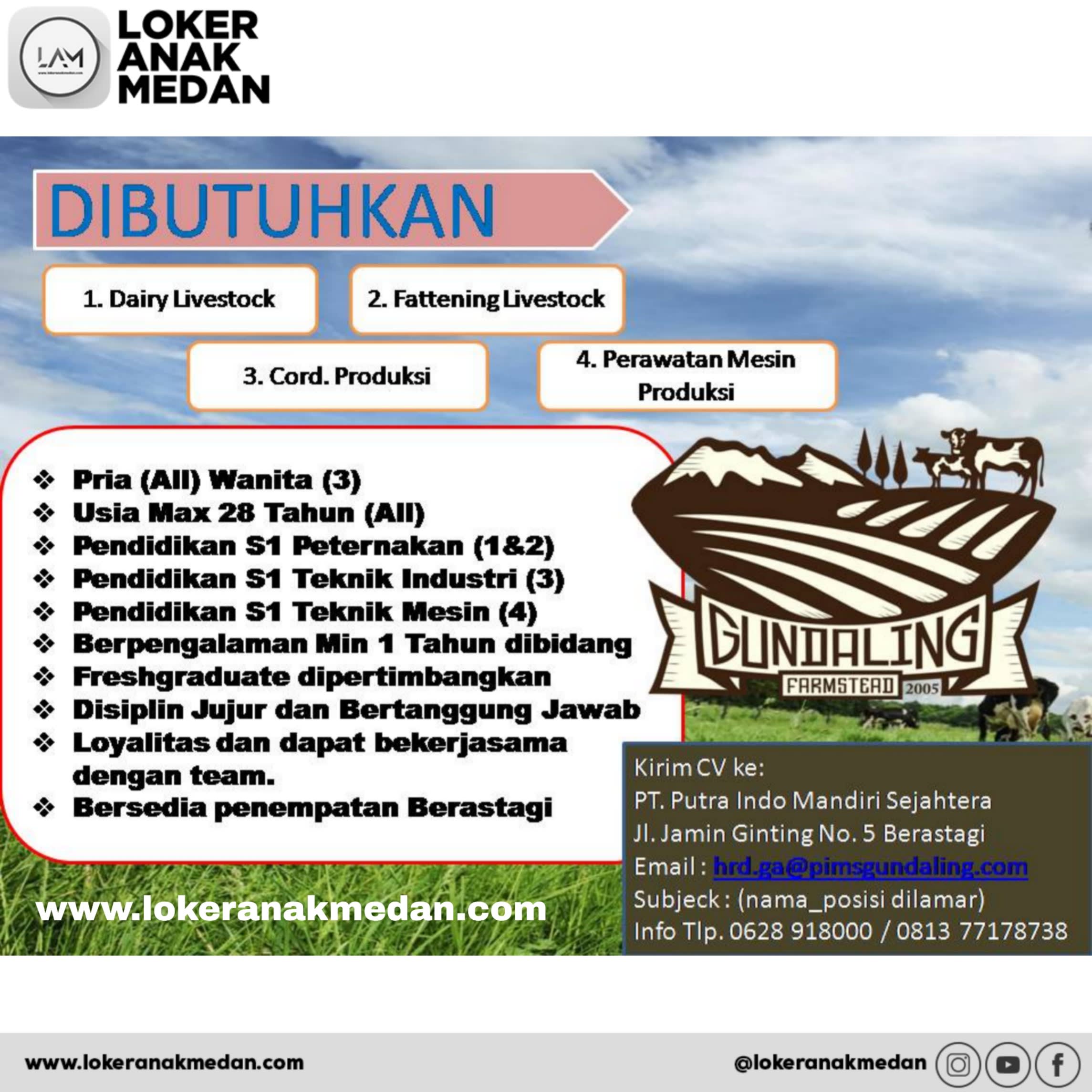 Info Loker Medan – PT Putra Indo Mandiri Sejahtera – Gundaling Farm adalah Perusahaan yang bergerak di bidang peternakan Sapi dan produsen susu sapi murni segar terbesar di Berastagi, Sumatera Utara. Saat ini perusahaan sedang membuka lowongan pekerjaan mecari kandidat terbaik, dinamis, pekerja keras untuk bergabung bersama tim.