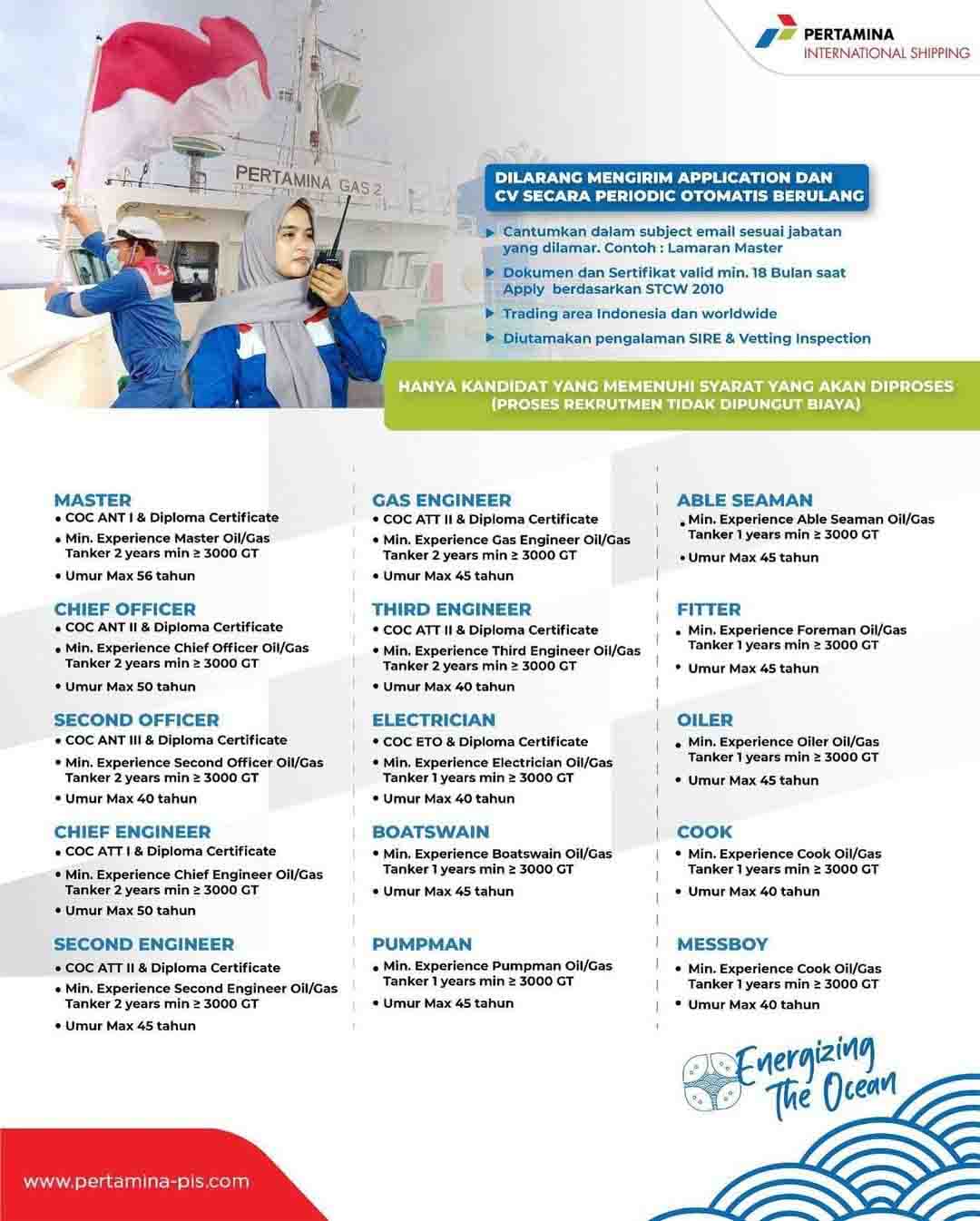 Dengan strategi bisnis yang matang, PIS berkomitmen untuk menjadi Integrated Marine Logistics Company terkemuka di Asia. PIS tidak hanya berfokus pada pelayaran dan logistik, namun juga terus mengembangkan lini bisnis lainnya yang mendukung bisnis inti perusahaan. Sebagai bagian dari PT Pertamina (Persero), PIS selalu berusaha untuk menjadi perusahaan yang kompetitif dan berdaya saing tinggi di kancah nasional maupun internasional. Saat ini perusahaan sedang membuka Lowongan Pertamina International Shipping, sebagai berikut: