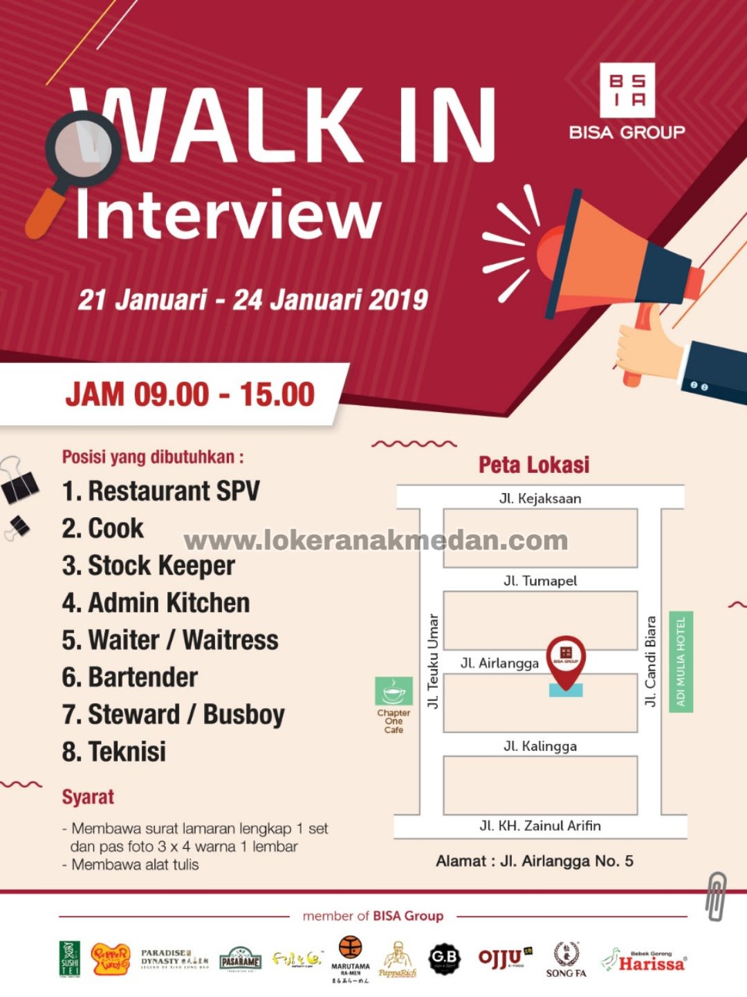 Info Loker Medan – BISA Group merupakan perusahaan yang bergerak di bidang Food & Beverage terbesar di Kota Medan. Saat ini perusahaan kami sedang membutuhkan tenaga kerja untuk posisi :